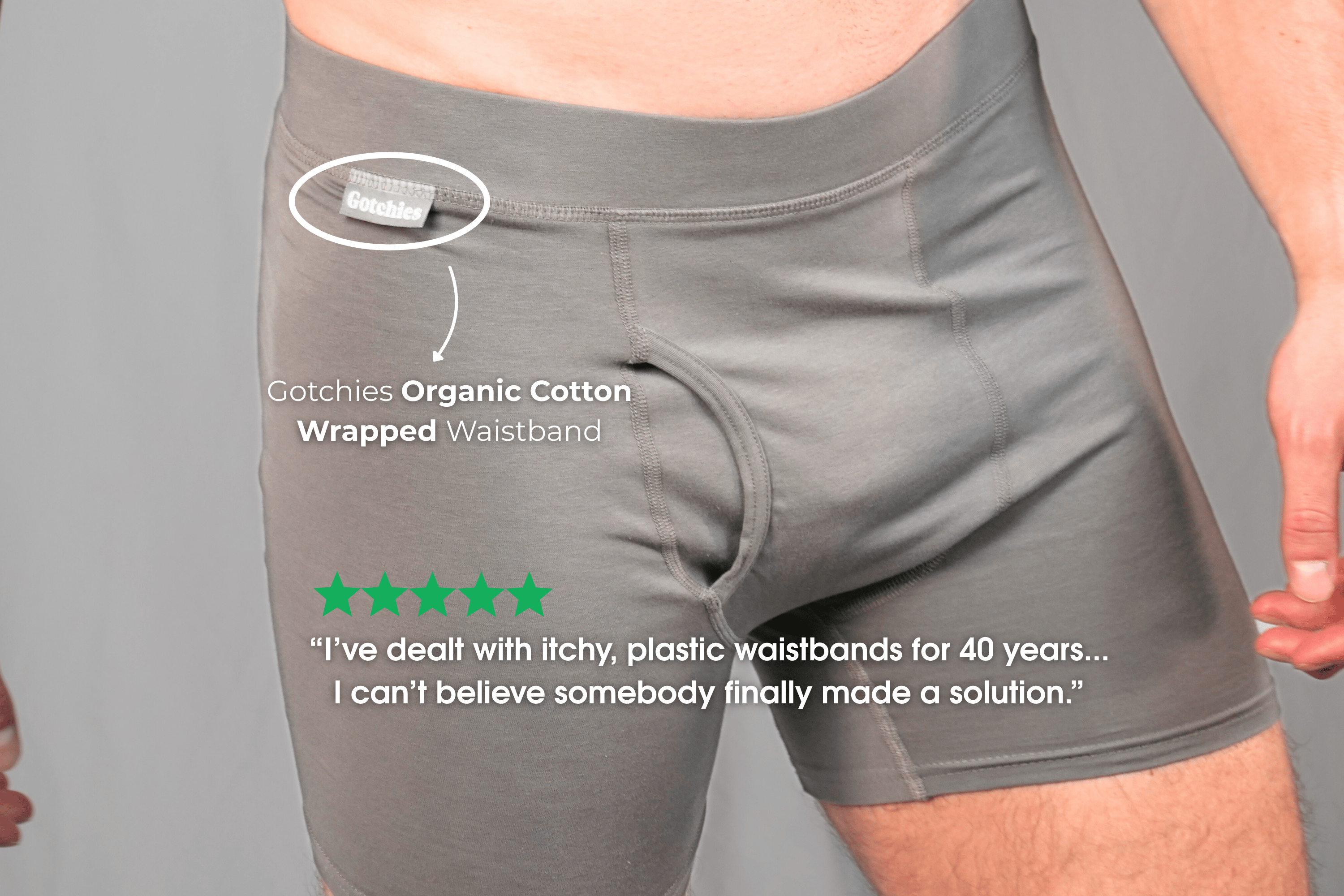 Gotchies was founded on the principle of putting your health and comfort first. When our options were either to use an elastic waistband with our branding (to help with promotion) or to wrap cotton around the elastic band and lose the branding, we instantly knew which choice to make.